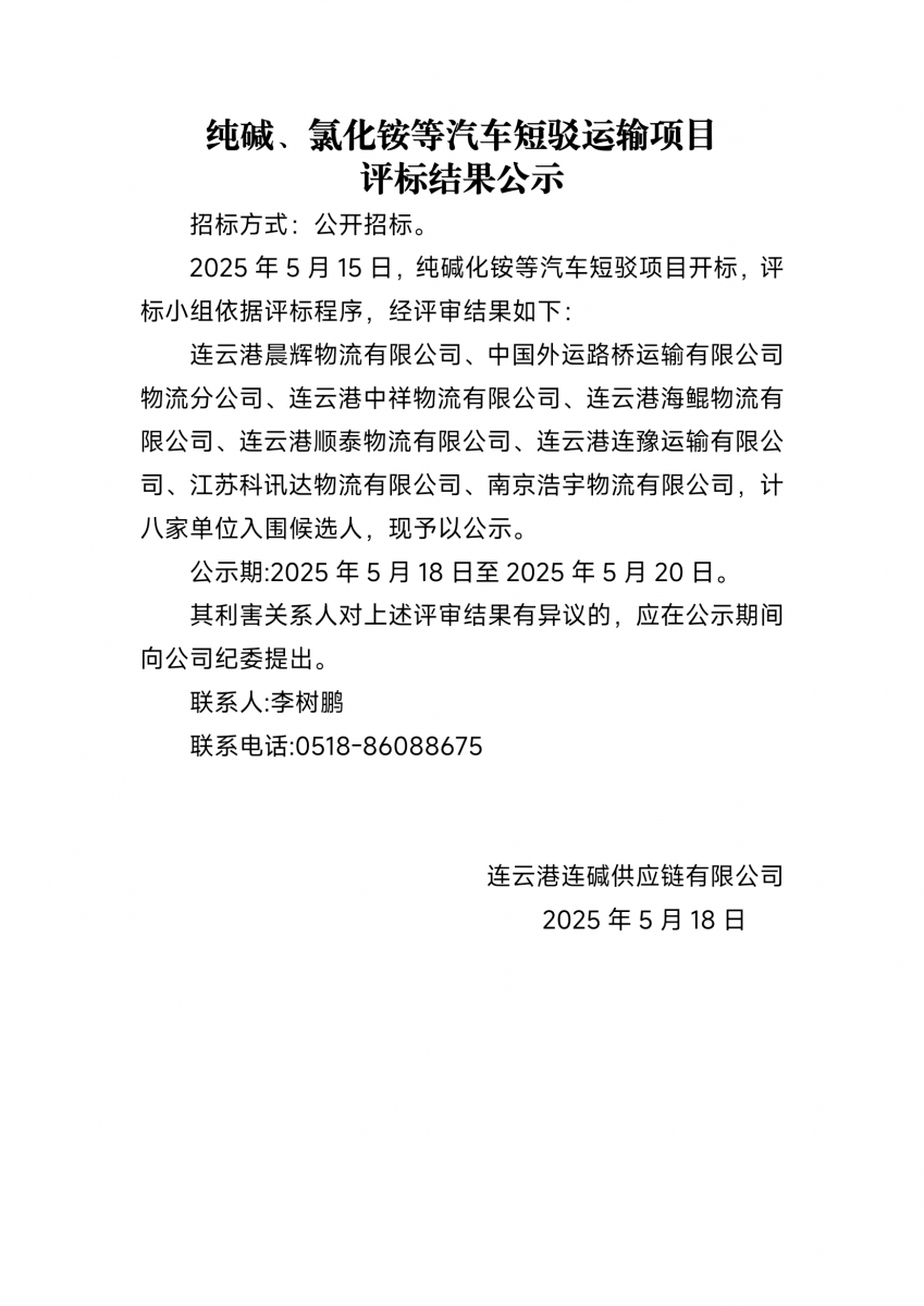 连云港连碱供应链有限公司纯碱、氯化铵等汽车短驳运输项目评标结果公示