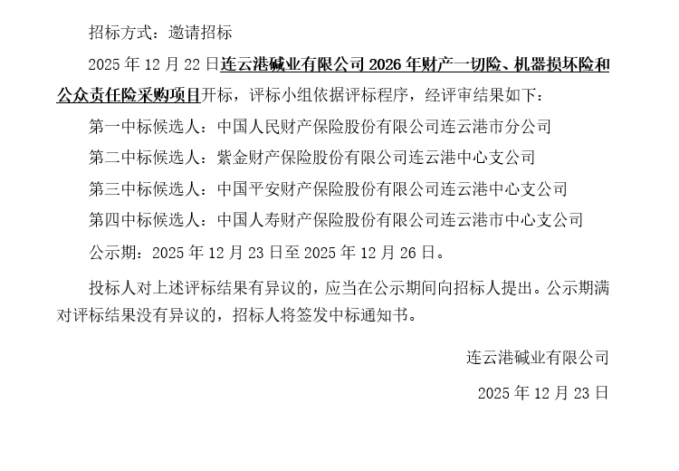 连云港碱业有限公司2026年财产一切险、机器损坏险和公众责任险采购项目中标候选人公示