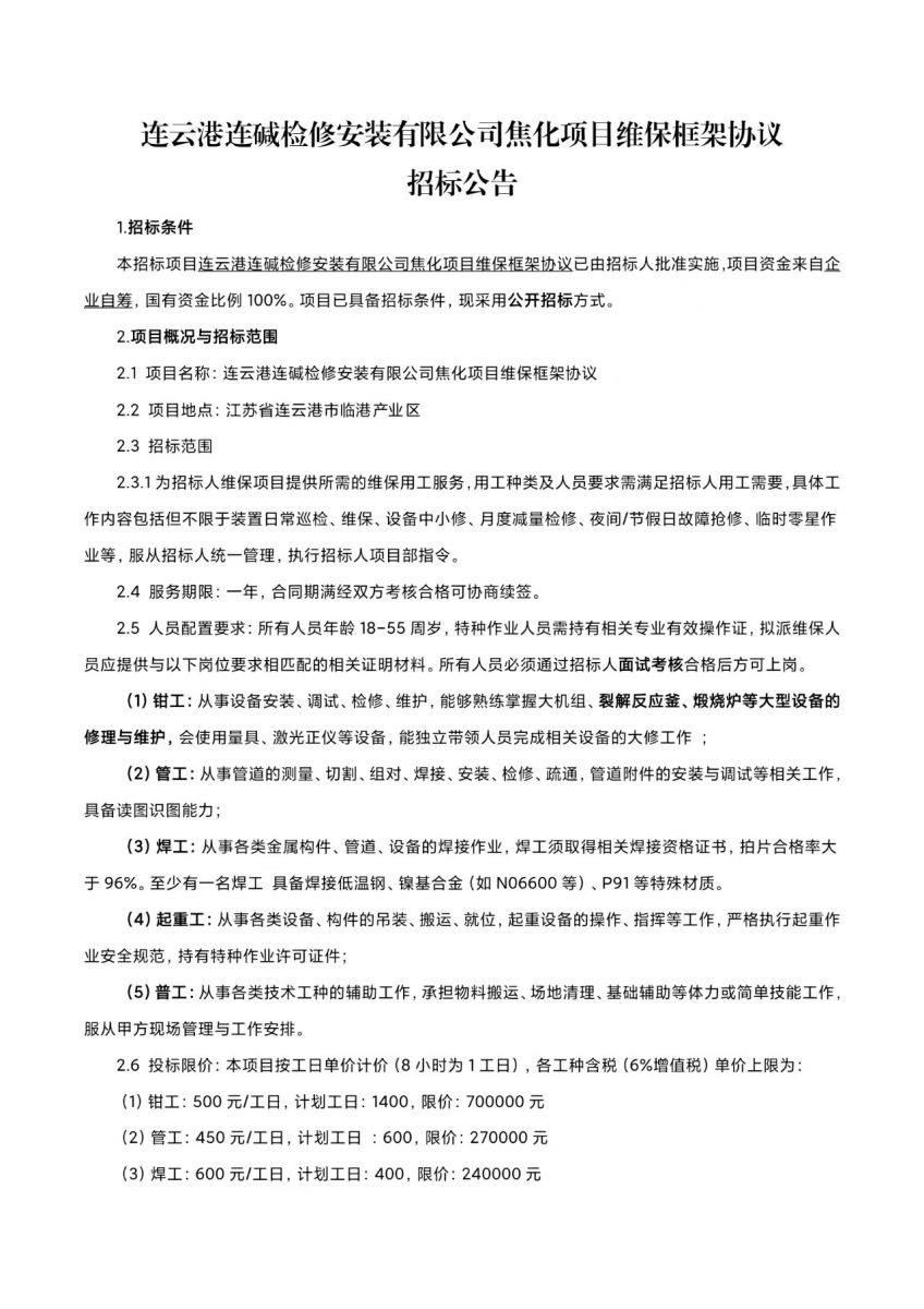连云港连碱检修安装有限公司焦化项目维保框架协议招标公告